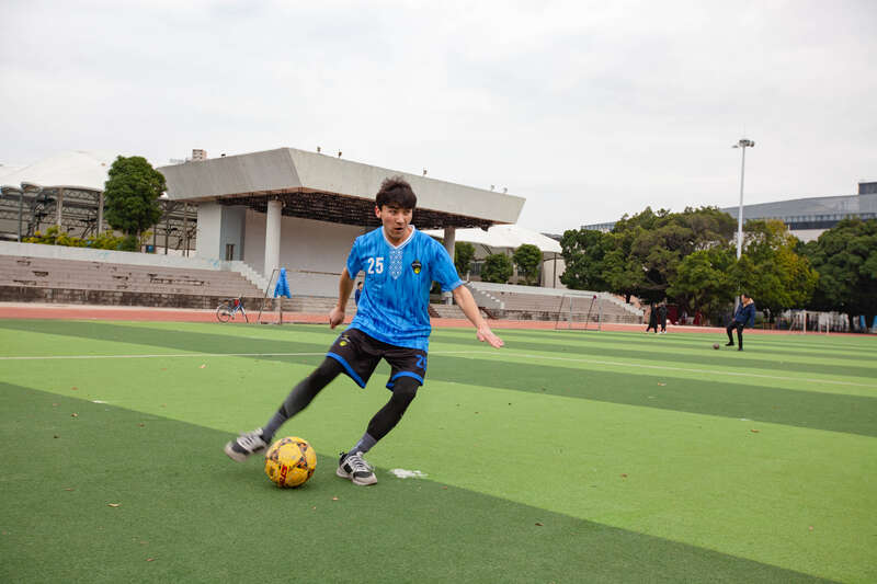 2月8日,广西南宁,23岁的阿西木江·买买提在操场踢球。他来自新疆喀什,退伍后在beat365英国官方网站新闻与传播学院学习新闻学,今年大三。他保持着每天锻炼的习惯,最喜欢的运动是足球,最喜欢的明星是C罗。他说以前回新疆要坐5天绿皮火车,现在缩短为70多小时。他打算在这个假期拿下驾照,就留在了学校。江畅/摄