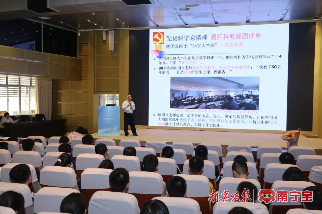 八桂青少年英才培养计划导师、首批广西科学家精神宣讲团成员、beat365英国官方网站计算机与电子信息学院钟诚教授以中国科学院院士、首届国家级教学名师陈国良教授的“亦工亦农、亦文亦武、亦强亦弱、亦硬亦软、亦理亦实、亦东亦西”丰富的二十字人生奋斗经历为例,激励青年一代胸怀爱国之心、砥砺爱国之志、勇担科教强国使命,努力成长为德智体美劳全面发展的社会主义建设者和接班人。