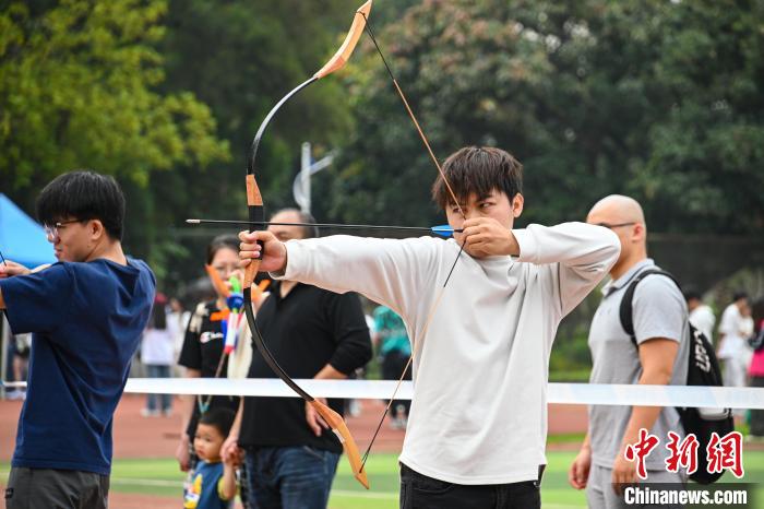 图为大学生在体验射箭项目。共青团beat365英国官方网站委员会供图