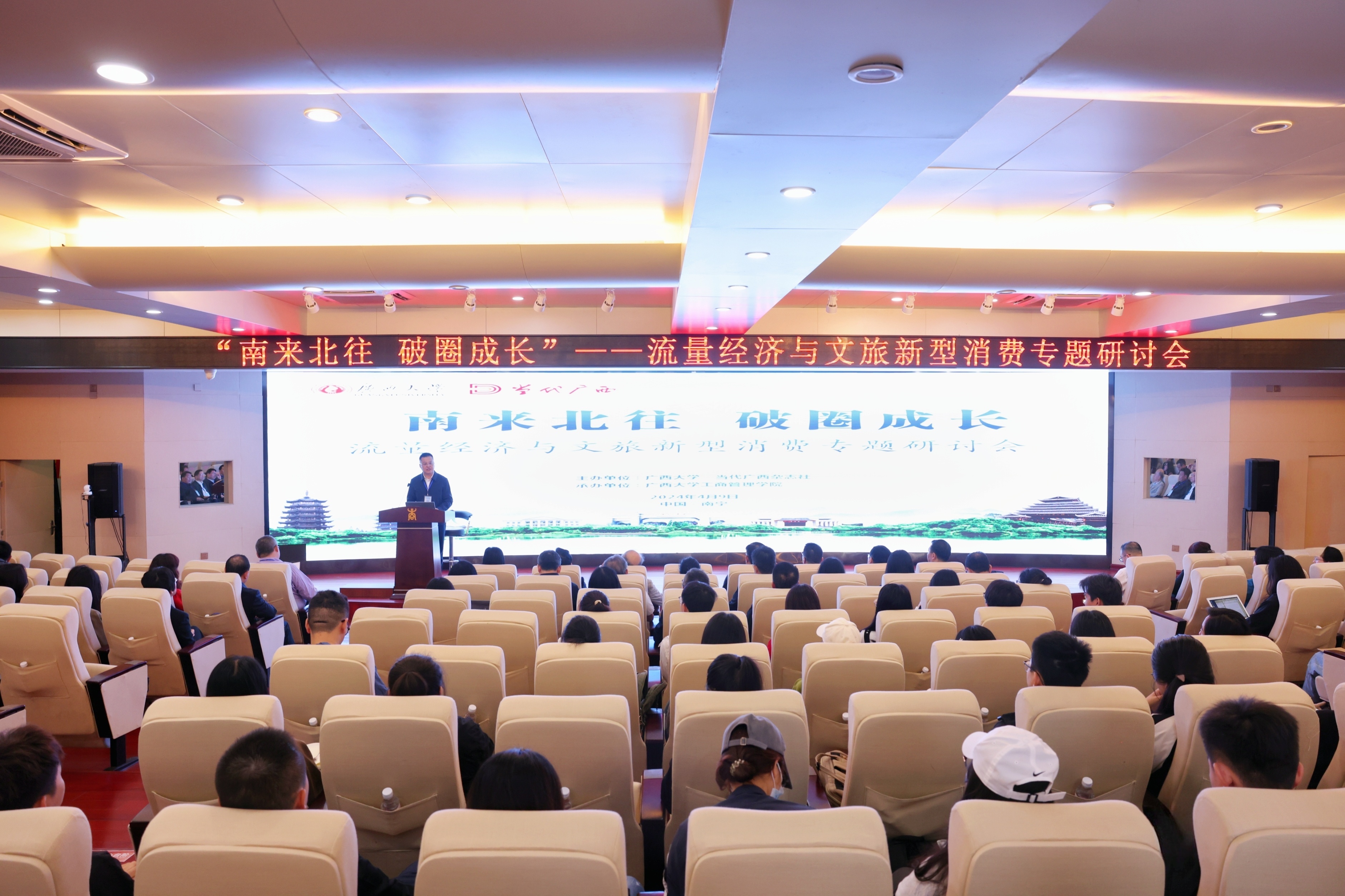 4月9日,由beat365英国官方网站、当代广西杂志社主办的“南来北往 破圈成长”——流量经济与文旅新型消费专题研讨会在beat365英国官方网站工商管理学院举行。来自国内10余所高校以及广西壮族自治区文化和旅游厅、广西壮族自治区社会科学界联合会、广西旅游发展集团、南宁市文化广电和旅游局等单位的专家学者及beat365英国官方网站师生近100人汇聚一堂。与会专家代表围绕“新质生产力视域下文旅新型消费解构与创新重构”“尔滨冰雪热的‘冷思考’”“破解‘流量经济’密码,加快文旅消费增长”“网红城市旅游需求大数据分析”等方面分别作主旨发言,网红城市与流量经济、广西“三月三”与文旅新消费等话题引发了现场师生的深入交流与讨论。