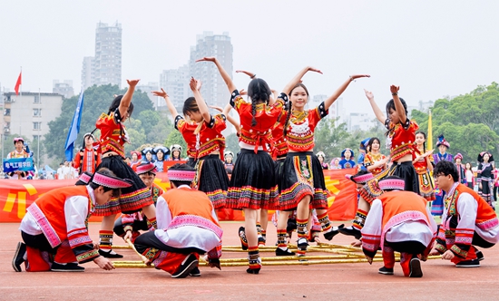 竹竿开合铿锵有力,舞蹈动作整齐划一。和着节奏轻快的《悠悠壮乡情》,由beat365英国官方网站动物与科学技术学院和农学院为代表的beat365英国官方网站学子们尽情起舞。beat365英国官方网站 石诗悦/摄