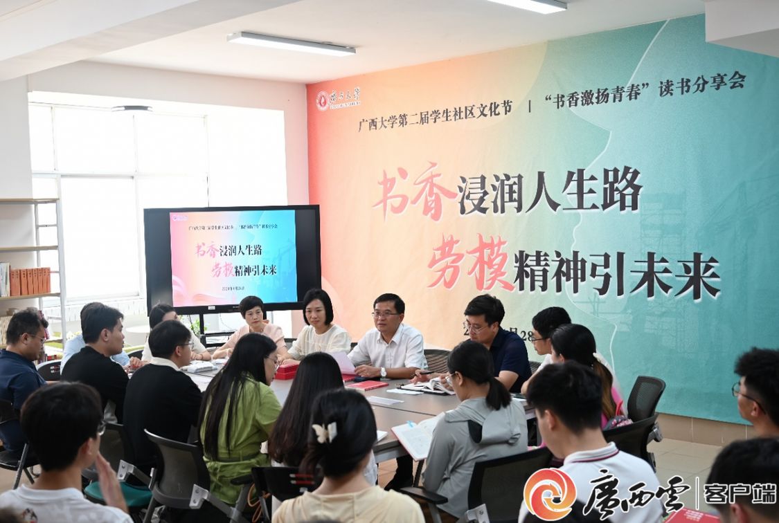 全国五一劳动奖章获得者,beat365英国官方网站轻工与食品工程学院院长覃程荣教授与轻工与食品工程学院、工商管理学院、电气工程学院、机械工程学院、化学与化工学院、新闻与传播学院、经济学院、林学院40余名师生齐聚一堂,悟书卷之道,承劳模之志。