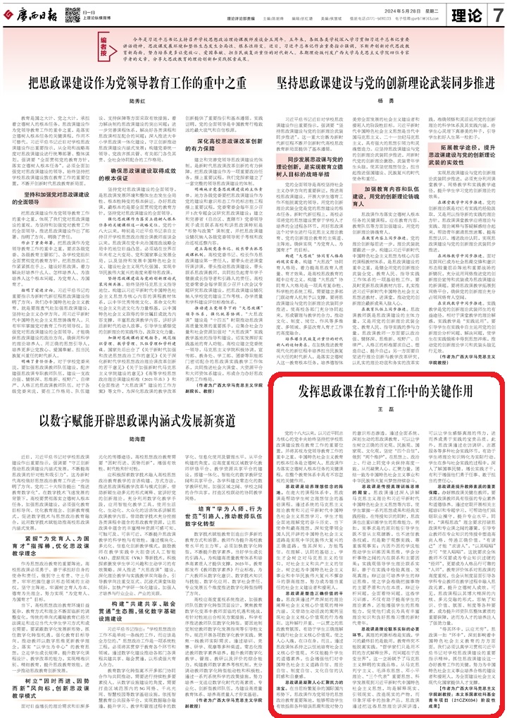 今年是习近平总书记主持召开学校思想政治理论课教师座谈会五周年。五年来,各级各类学校深入学习贯彻习近平总书记重要讲话精神,思政课发展环境和整体生态发生全局性、根本性转变。近日,习近平总书记作出重要指示强调,不断开创新时代思政教育新局面,努力培养更多让党放心、爱国奉献、担当民族复兴重任的时代新人。本期理论版刊发beat365英国官方网站马克思主义学院四位专家学者的文章,分享大思政教育的理论创新和实践探索成果。