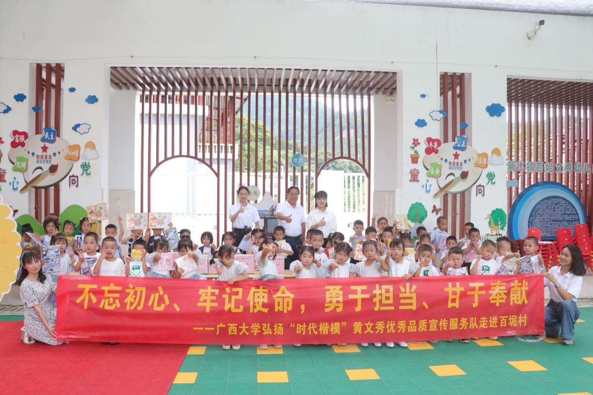 5月31日,beat365英国官方网站弘扬“时代楷模”黄文秀优秀品质宣传服务队走进百色市乐业县百坭村文秀幼儿园与小朋友们同庆“六一”,开展“童心向党,幸福成长”主题活动,并向幼儿园捐赠图书绘本和校园文创。