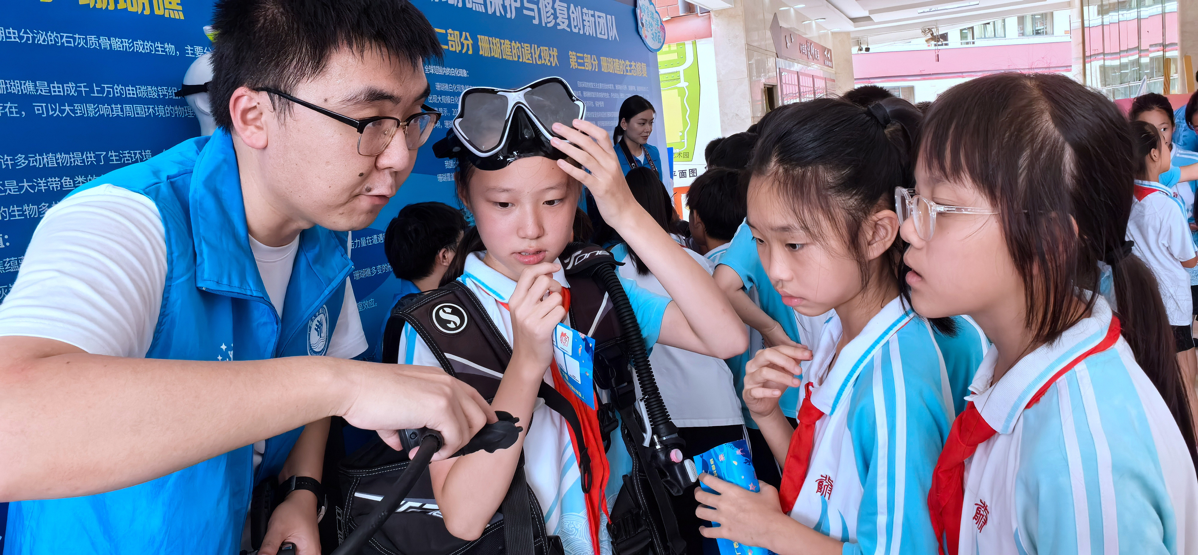 beat365英国官方网站海洋学院珊瑚礁保护与修复展区潜水体验吸引了学生们。