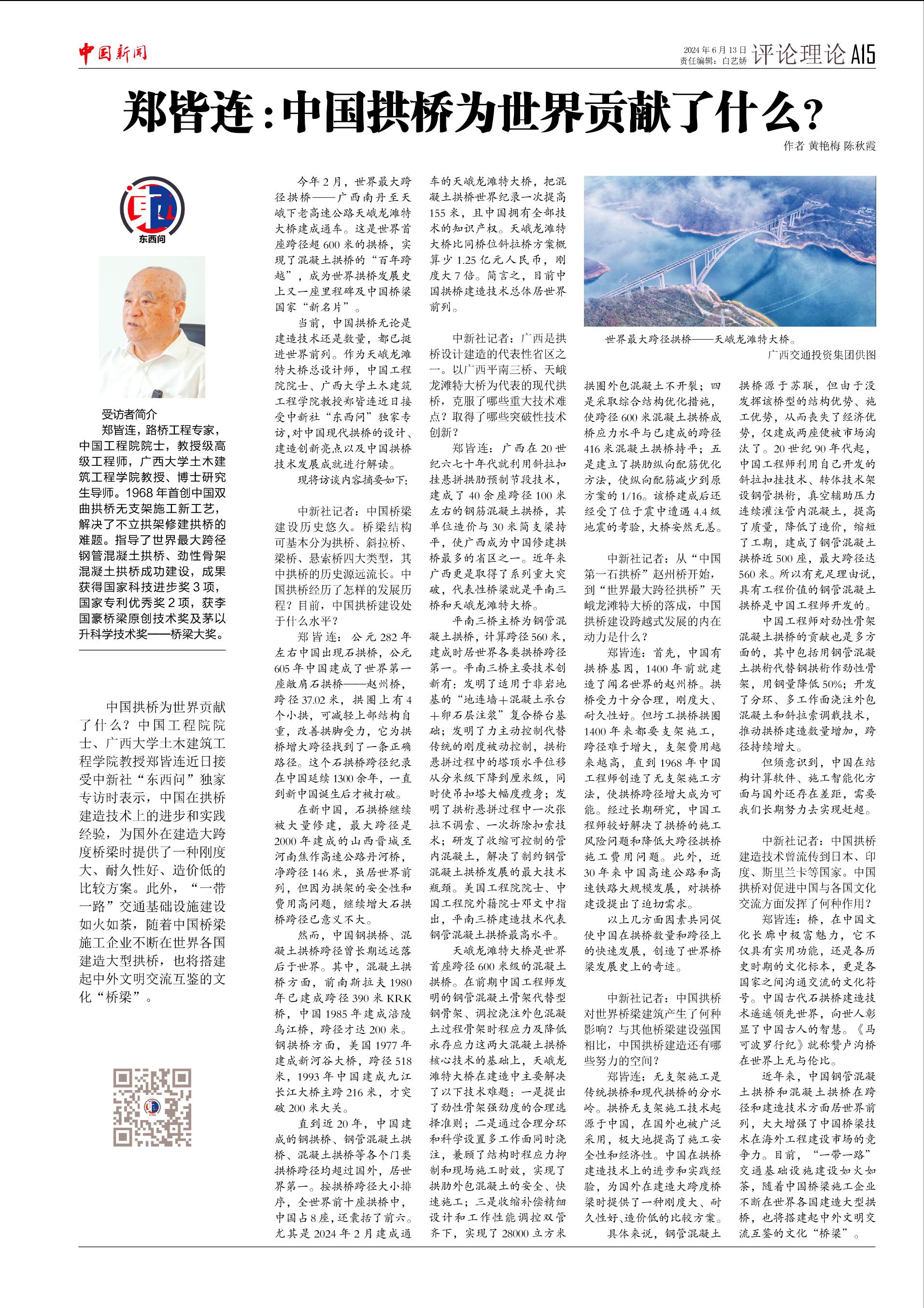 当前,中国拱桥无论是建造技术还是数量,都已挺进世界前列。作为天峨龙滩特大桥总设计师,中国工程院院士、beat365英国官方网站土木建筑工程学院教授郑皆连近日接受中新社“东西问”独家专访,对中国现代拱桥的设计、建造创新亮点以及中国拱桥技术发展成就进行解读。