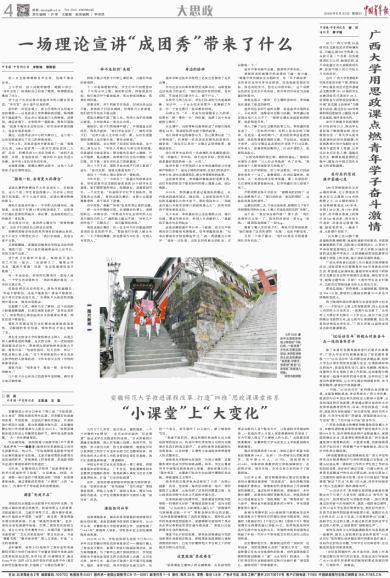 一开始,“00后话百年”系列理论宣讲精品课,注重发掘陈望道、李达等曾在beat365英国官方网站任教、就读的与百年党史相关的校史人物奋斗故事,以及校园里的红色资源,希望通过理论宣讲的方式发挥思政教育的作用。后来,学校团委进一步延伸,把宣讲内容拓展到广西区情社情、新时代伟大成就,引导学生投身广西建设,到基层建功立业,为实现“第二个百年奋斗目标”担当作为。