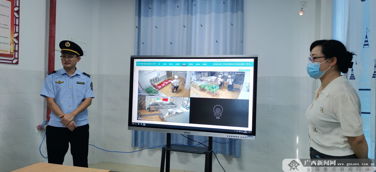 南宁市大学东路幼儿园食堂工作人员介绍展示“互联网+明厨亮灶”智慧服务平台。实习生 廖怡宁 摄