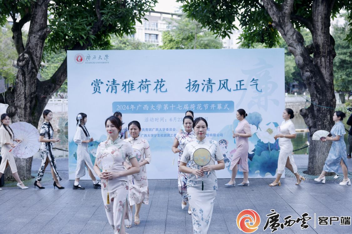 现场,歌舞《荷塘月色》、荷花主题国风旗袍走秀、“荷花仙子”湖面巡游等精彩节目引得路人纷纷驻足欣赏,荷花主题摄影及书画作品展、荷花DIY油画和漆扇体验等系列活动更是吸引了众多师生前来打卡。大家纷纷在廉洁主题横幅和倡议书上签名,表达自己弘扬敬廉崇洁优良传统、增强廉洁自律意识、培养学术自律精神、建设清廉西大的决心。