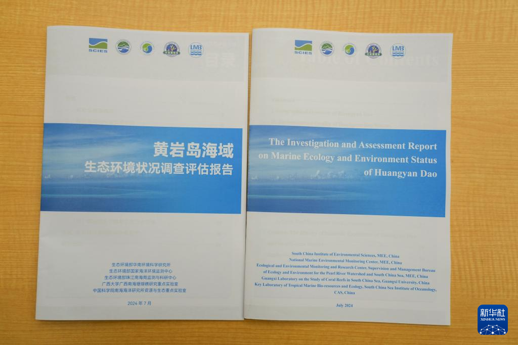 这是在北京的发布现场拍摄的《黄岩岛海域生态环境状况调查评估报告》中文版和英文版(7月10日摄)。新华社记者 张玉薇 摄
