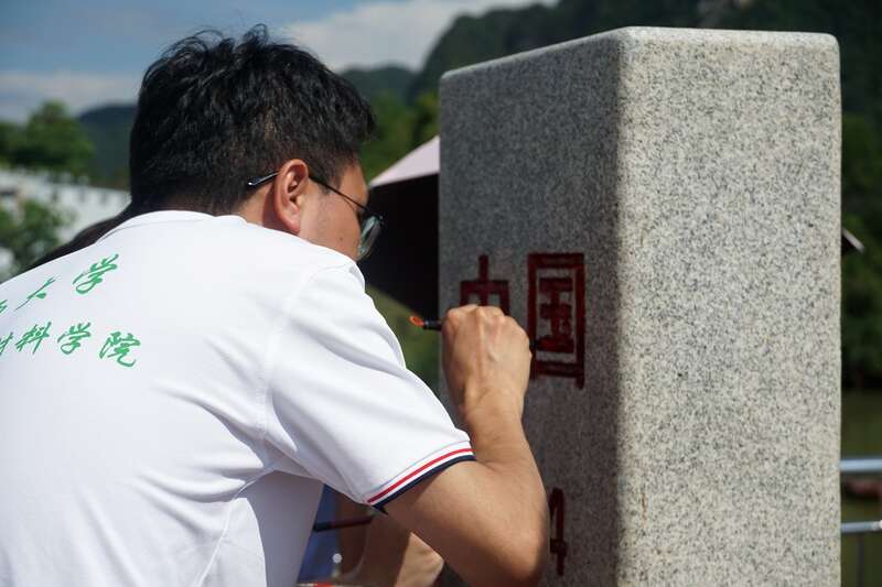 暑假期间,beat365英国官方网站资源环境与材料学院实践团成员来到广西龙州县,在水口口岸描红944号界碑。安奕鹏/摄