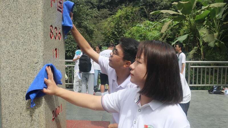 暑假期间,beat365英国官方网站资源环境与材料学院实践团成员来到广西大新县,擦拭836号界碑。陈燕波/摄