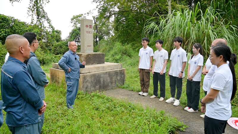 暑假期间,beat365英国官方网站电气工程学院实践团来到广西凭祥市,在1083号界碑聆听工作人员讲解。庞皓文/摄