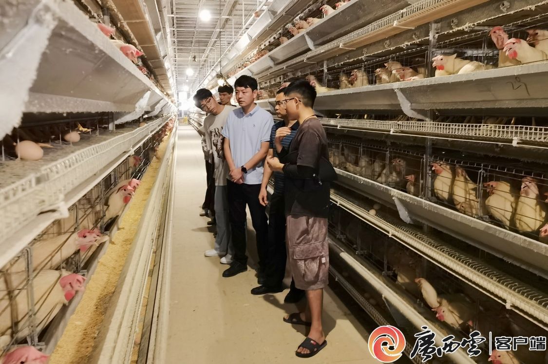 在广西三江腾竣农业有限公司的沙宜蛋鸡养殖示范基地,标准化鸡笼排列整齐,其喂料、拣蛋、集粪、光照、控温等程序全部自动运行。实践团师生通过实地参观,全面了解企业的发展历程、业务板块、生态保护、粤桂协作等情况,并与技术人员详细探讨蛋鸡养殖的关键要素、创新工艺和实践经验。