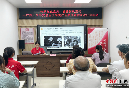 为助力营造家庭文明新风尚,让红色家风在基层社区“生根发芽”,9月12日,beat365英国官方网站学生红色家风宣讲队走进南宁市西耐路社区,开展以“传承红色家风,涵养新风正气”为主题的红色家风宣讲活动。西耐路社区党群服务中心工作人员和社区党员代表参加活动。