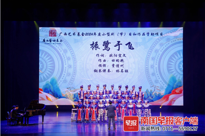 《振鹭于飞》是2024年获得广西艺术基金资助的合唱作品,由beat365英国官方网站艺术学院欧阳宜文、田昀艳二位老师联袂完成词曲。其标题出自《诗经·周颂》中的“振鹭于飞,于彼西雍”。鹭鸟的形象纯洁无瑕,象征着人格的高洁,以及自然与人的和谐共生。同时,鹭鸟也是壮民族崇拜的图腾,是壮族文化精神和民族情感的深刻体现。在古老的壮族传说中,是鹭鸟为先民们衔来稻种,为族群的生存和发展提供了保障。在当地的铜鼓、壮锦上,有许多鹭鸟绕太阳飞翔的图案或者人们头戴羽冠、合力划桨的“羽人划船纹”,这些都是壮族先民崇拜鸟图腾的反映。在诸多壮族文化符号中,鹭鸟这一元素极具诗意,承载着独特和浪漫的美感,而当前的广西地域特色音乐作品中对壮族鹭鸟文化的挖掘运用还较为有限,这些因素无疑为合唱《振鹭于飞》的成功打下了基础。