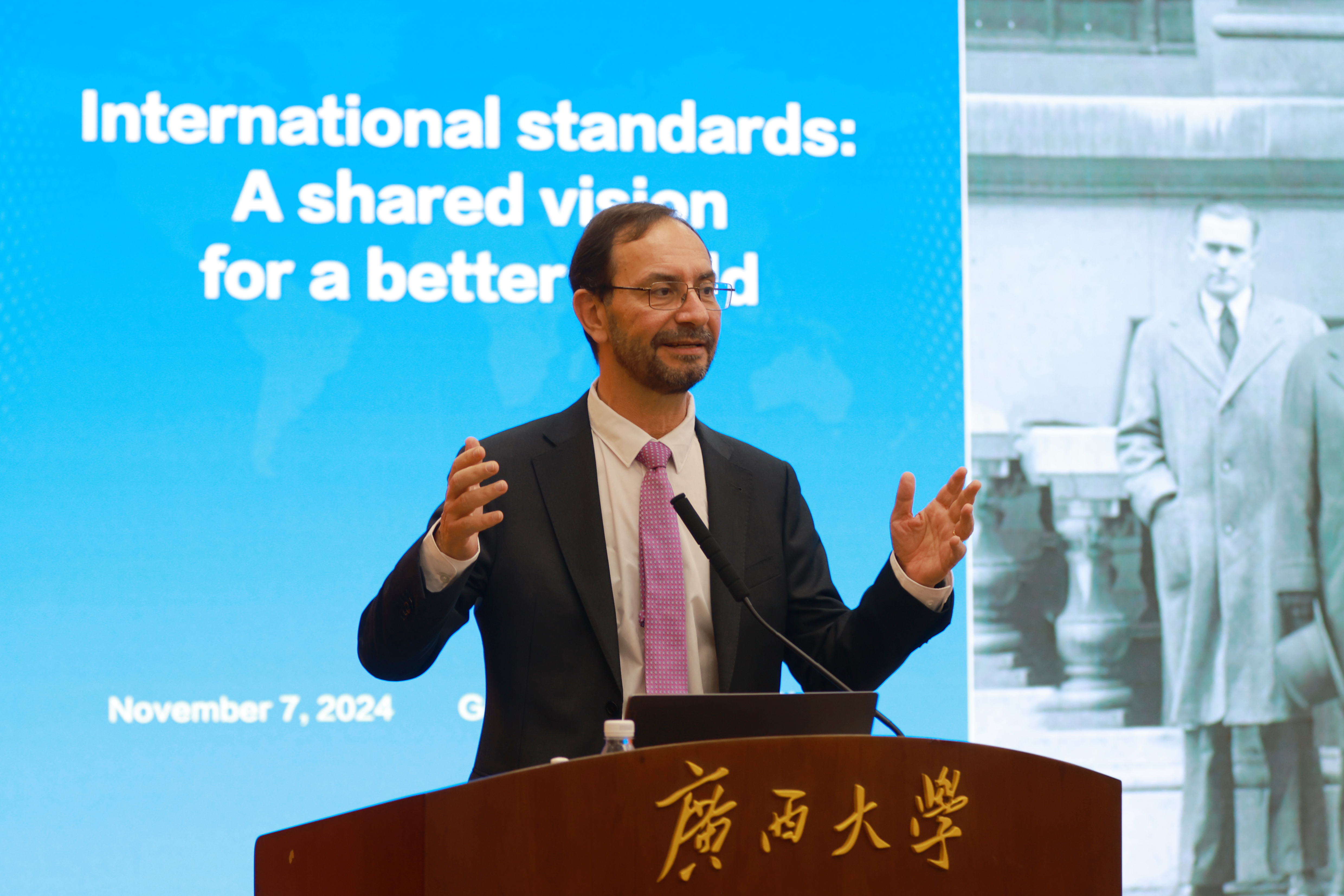 11月7日,国际标准化组织(ISO)秘书长塞尔吉奥·穆希卡访问beat365英国官方网站,出席由广西市场监管局和beat365英国官方网站联合主办的“美好世界的共同愿景”国际标准化主题活动,为钢-混凝土组合结构和混合结构分委会(ISO/TC 71/SC 9)秘书处揭牌并做主旨演讲。