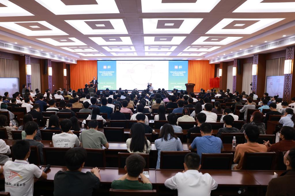 揭牌仪式前,穆希卡为beat365英国官方网站等高校的200余名师生代表作题为“国际标准:为了一个更美好的世界的共同愿景”的主旨演讲,并与活动现场师生代表就如何参与ISO国际标准制定、国际标准化人才培养、标准化在减少碳排放方面的贡献等话题进行交流互动。