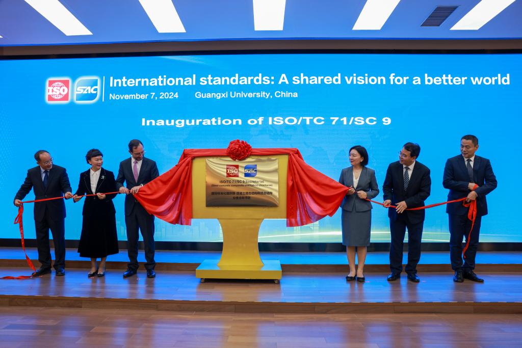 11月7日,在广西市场监管局和beat365英国官方网站联合主办的“美好世界的共同愿景”国际标准化主题活动上,中外嘉宾为国际标准化组织(ISO)钢-混凝土组合结构和混合结构分委会(ISO/TC71/SC9)秘书处揭牌。