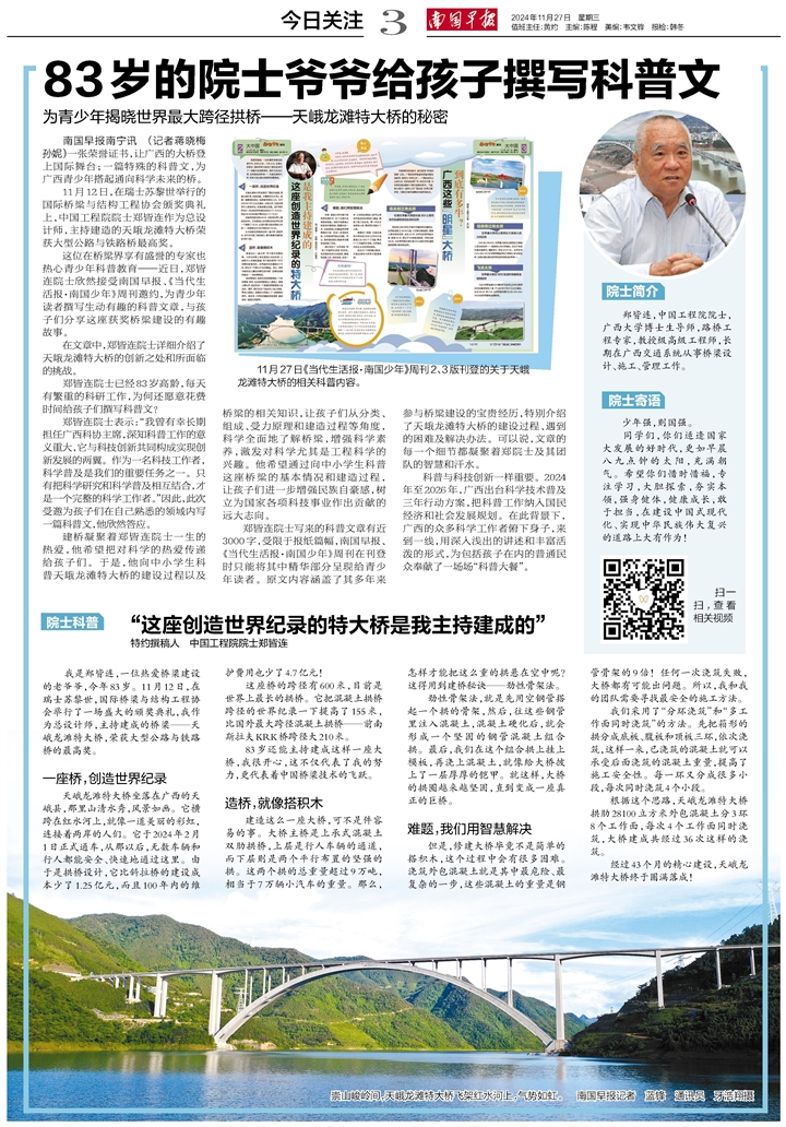 我是郑皆连,一位热爱桥梁建设的老爷爷,今年83岁。11月12日,在瑞士苏黎世,国际桥梁与结构工程协会举行了一场盛大的颁奖典礼,我作为总设计师,主持建成的桥梁——天峨龙滩特大桥,荣获大型公路与铁路桥的最高奖。