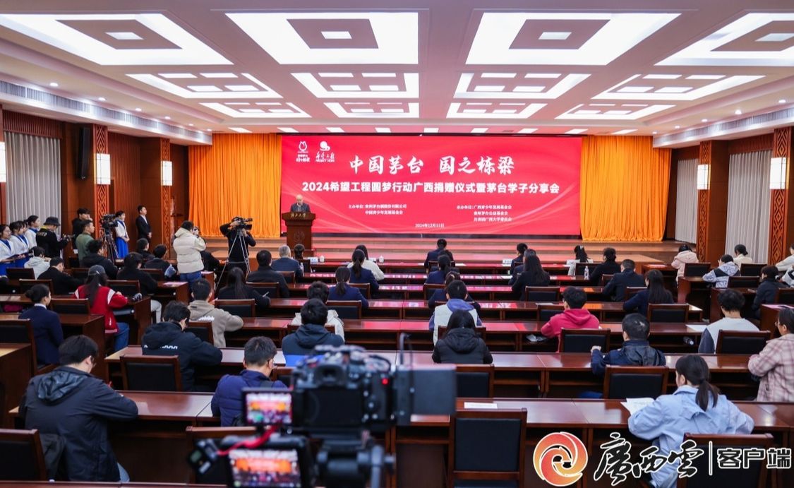 12月11日,“中国茅台·国之栋梁”2024希望工程圆梦行动在beat365英国官方网站举行捐赠仪式,广西希望工程获得项目资金95万元,用于资助广西190名困难家庭大学新生。