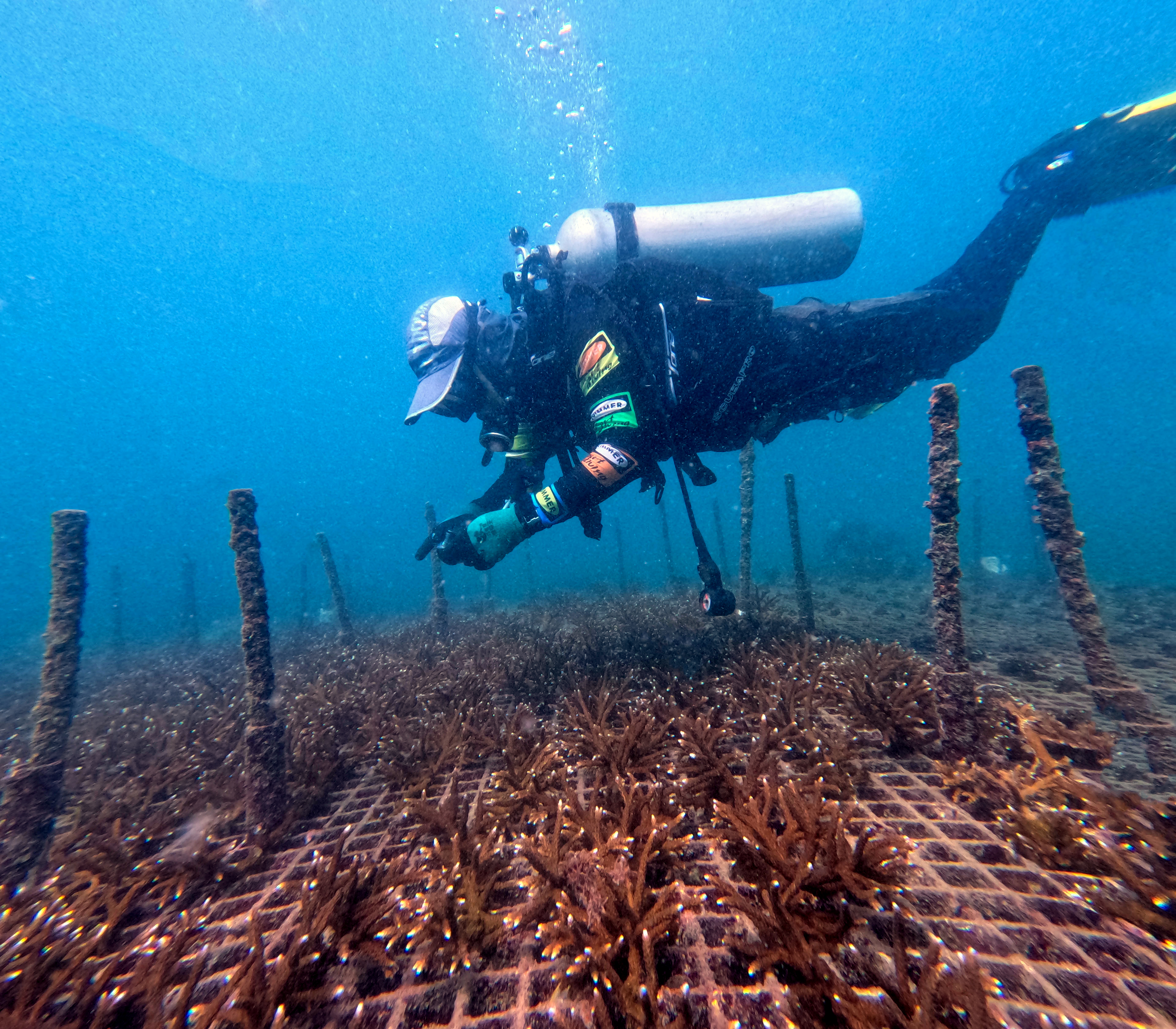 ▲黄雯在海底“种珊瑚”。受访者供图
