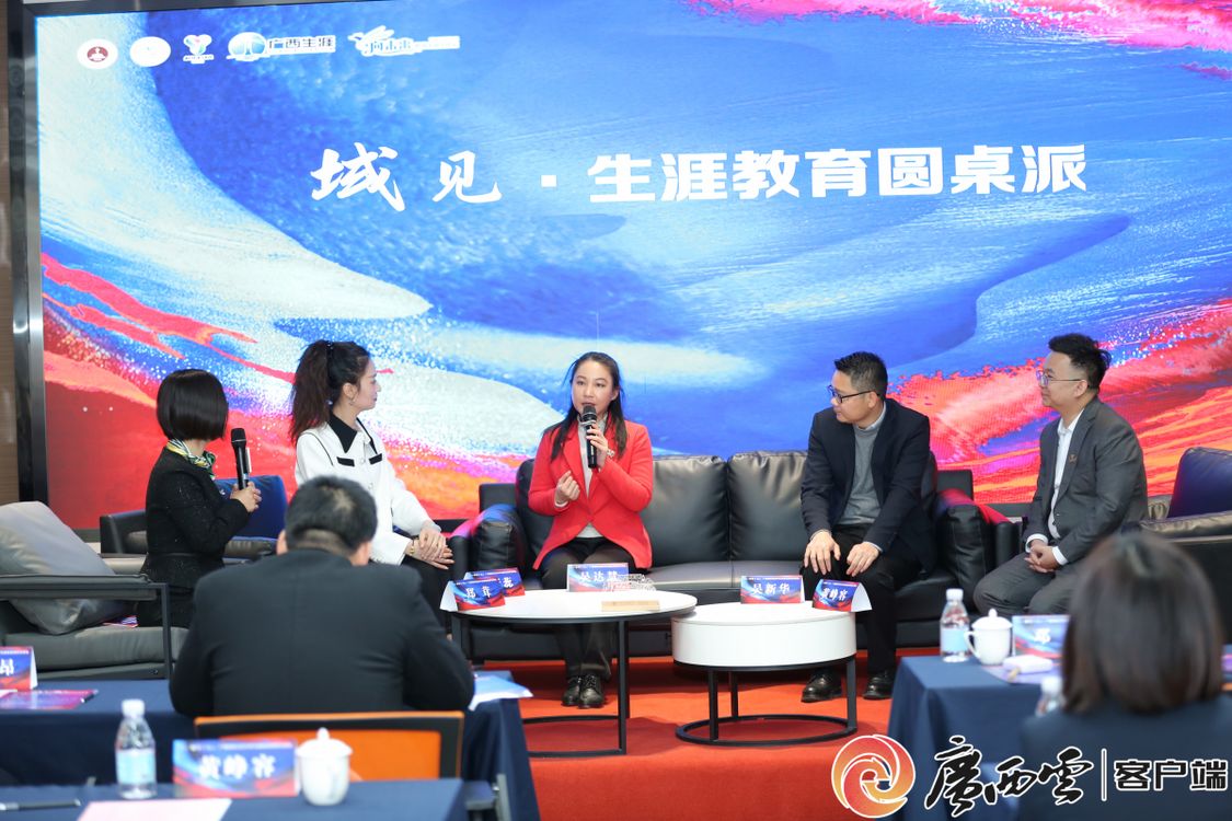 在域见·生涯教育圆桌交流会上,南宁市人力资源和社会保障局副局长吴新华从政府人力资源与社会保障部门视角谈人才市场需求变化与高校生涯教育改革;全国辅导员年度人物、beat365英国官方网站马克思主义学院党委常务副书记吴达慧谈高校如何促进思政教育与生涯教育融合;广西屹牙集团创始人董事长、广西医科大学屹牙·校友之家负责人黄峥容从企业用人视角谈高校在校生与毕业生的生涯教育创新;共青团全国十九大代表、广西电视台主持人李新蕊从青年人才视角谈现代青年的软实力塑造与生涯教育。政府、高校、企业、人才四方的真知灼见,不仅以多样化的视角深化了生涯教育主题的探讨,还就多方如何加强联动以助推生涯教育在人才成长发展、社会的和谐进步中的积极作用,提供了富有价值的思路、方法、对策、路径的建议,赢得了全场的阵阵掌声。