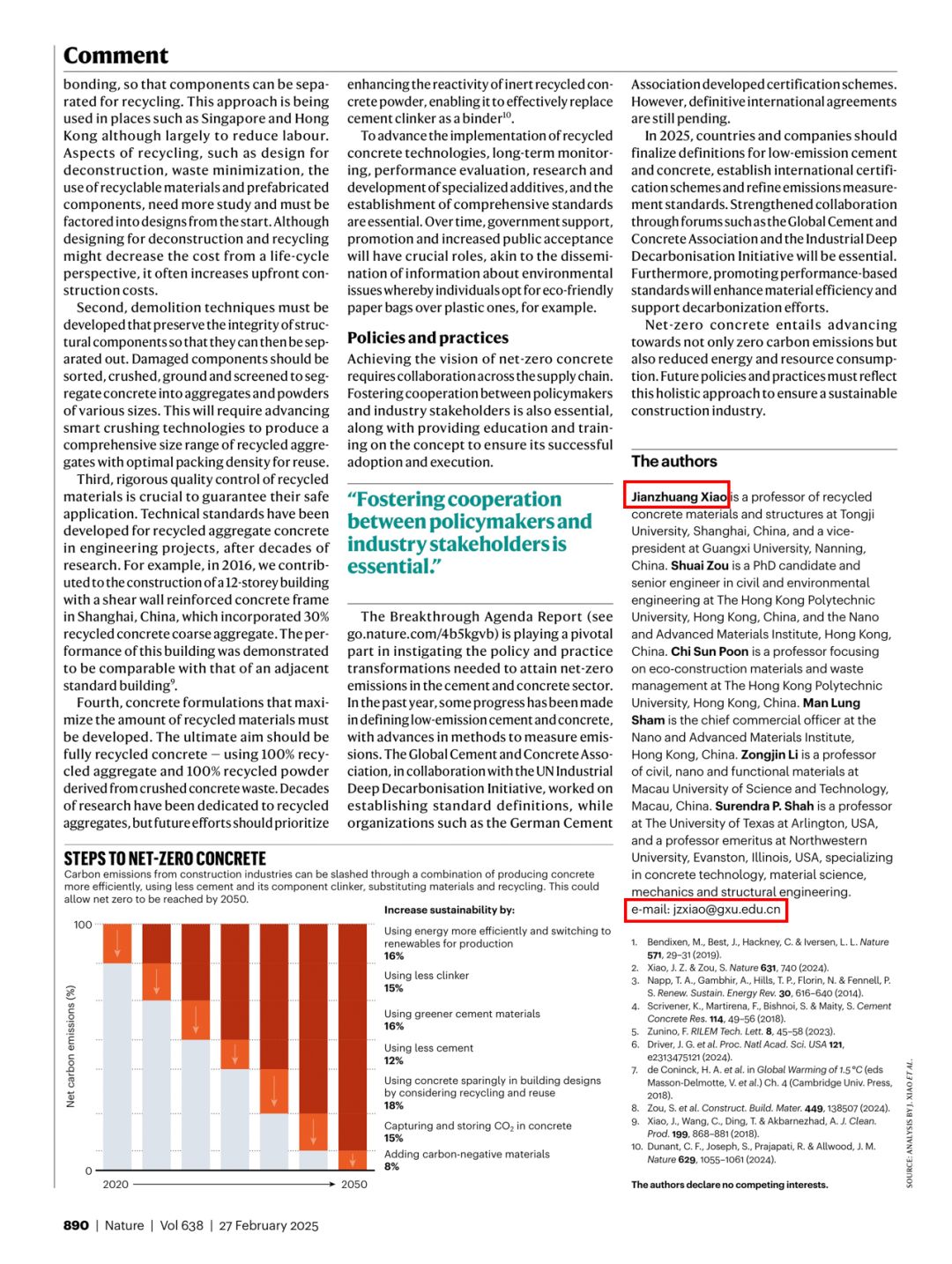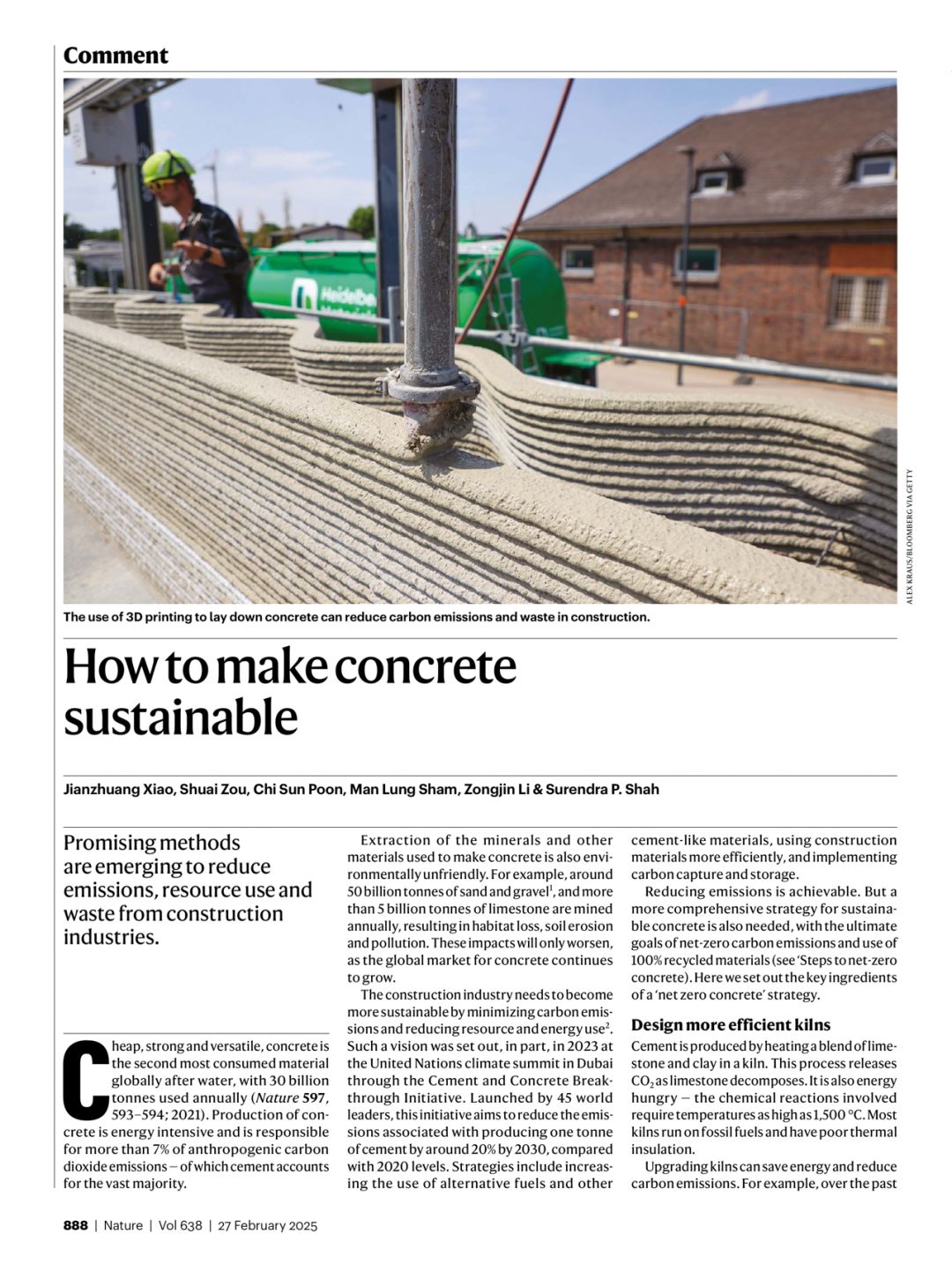 近日,beat365英国官方网站党委常委、副校长,beat365英国官方网站双碳科学与技术研究院院长,同济大学长聘教授肖建庄携手来自不同国家和机构的顶尖学者,以beat365英国官方网站作为通讯单位,在国际顶级学术期刊《Nature》发表评论性文章 “How to make concrete sustainable”,为建筑关键材料的绿色可持续发展提供了清晰的科学依据和技术路线图,引发广泛关注。