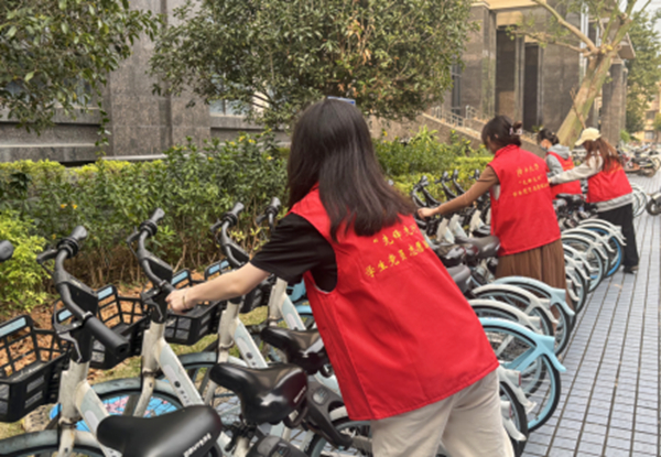 学生党员将教学楼附近的自行车、电动车摆放整齐