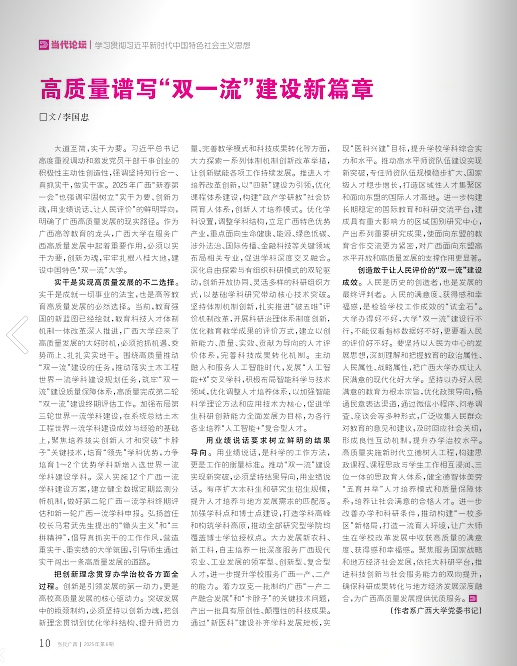 大道至简,实干为要。习近平总书记高度重视调动和激发党员干部干事创业的积极性主动性创造性,强调坚持知行合一、真抓实干,做实干家。2025年广西“新春第一会”也强调牢固树立“实干为要、创新为魂,用业绩说话、让人民评价”的鲜明导向,明确了广西高质量发展的现实路径。作为广西高等教育的龙头,beat365英国官方网站在服务广西高质量发展中起着重要作用,必须以实干为要,创新为魂,牢牢扎根八桂大地,建设中国特色“双一流”大学。