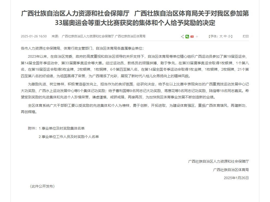 日前,广西壮族自治区人力资源和社会保障厅、广西壮族自治区体育局印发《关于对我区参加第33届奥运会等重大比赛获奖的集体和个人给予奖励的决定》,兰星宇作为第19届亚运会体操男子团体、男子吊环2枚金牌运动员,给予记大功奖励。
