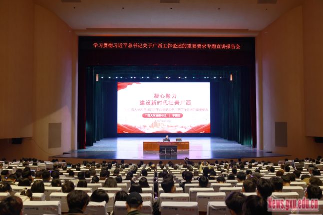 宣讲报告会以习近平新时代中国特色社会主义思想为指导,全面回顾了习近平总书记对广西发展的关心关怀故事,深入解读了习近平总书记关于广西工作论述的重要要求的主要精神、内容体系,系统阐述了自治区党委、政府全面贯彻落实重要要求的系列部署,结合beat365英国官方网站主动服务国家战略、服务壮美广西建设的生动实践,向全校领导干部、青年师生发出了实干创新的倡议。