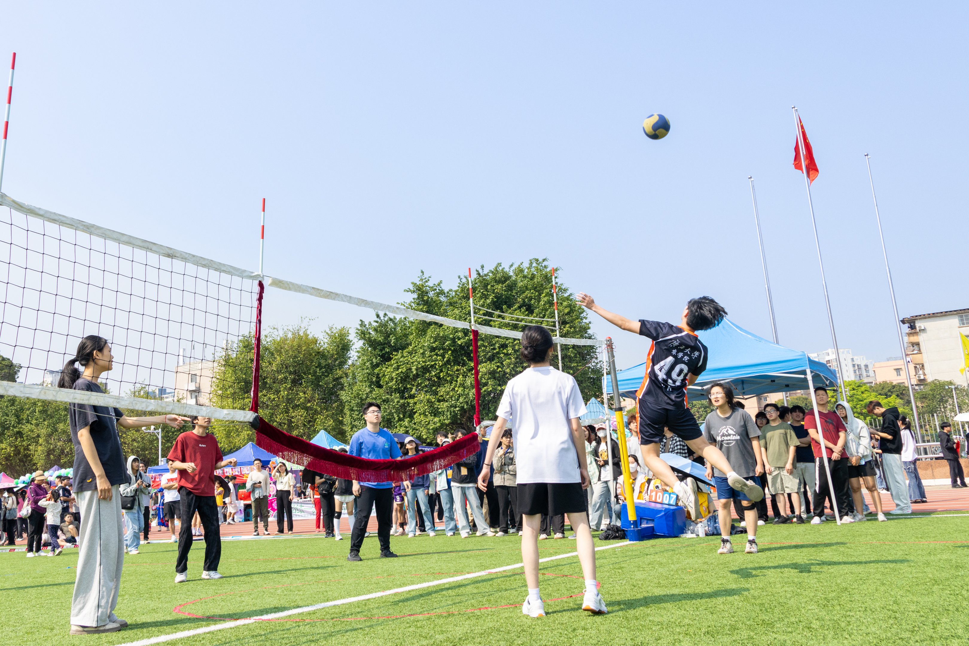上午九点半,活动开幕式正式开始。百名学子身穿多彩的民族服装,在交错的竹竿间欢快跃动,展现出别样的民族风采。醒狮跳跃、祥龙舞动,伴着《幸福山歌》的节奏齐跳民族舞,现场喝彩声不断。