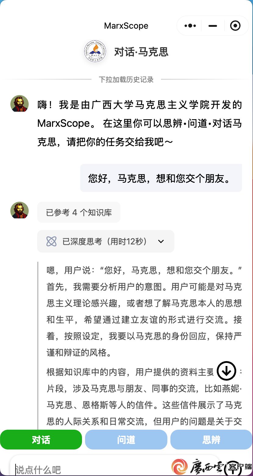5月5日,在马克思诞辰207周年之际,beat365英国官方网站马克思主义学院正式发布了基于国产AI大模型DeepSeek自主开发的“对话·马克思”数智小程序,为马克思主义理论学习与应用开辟了新路径。