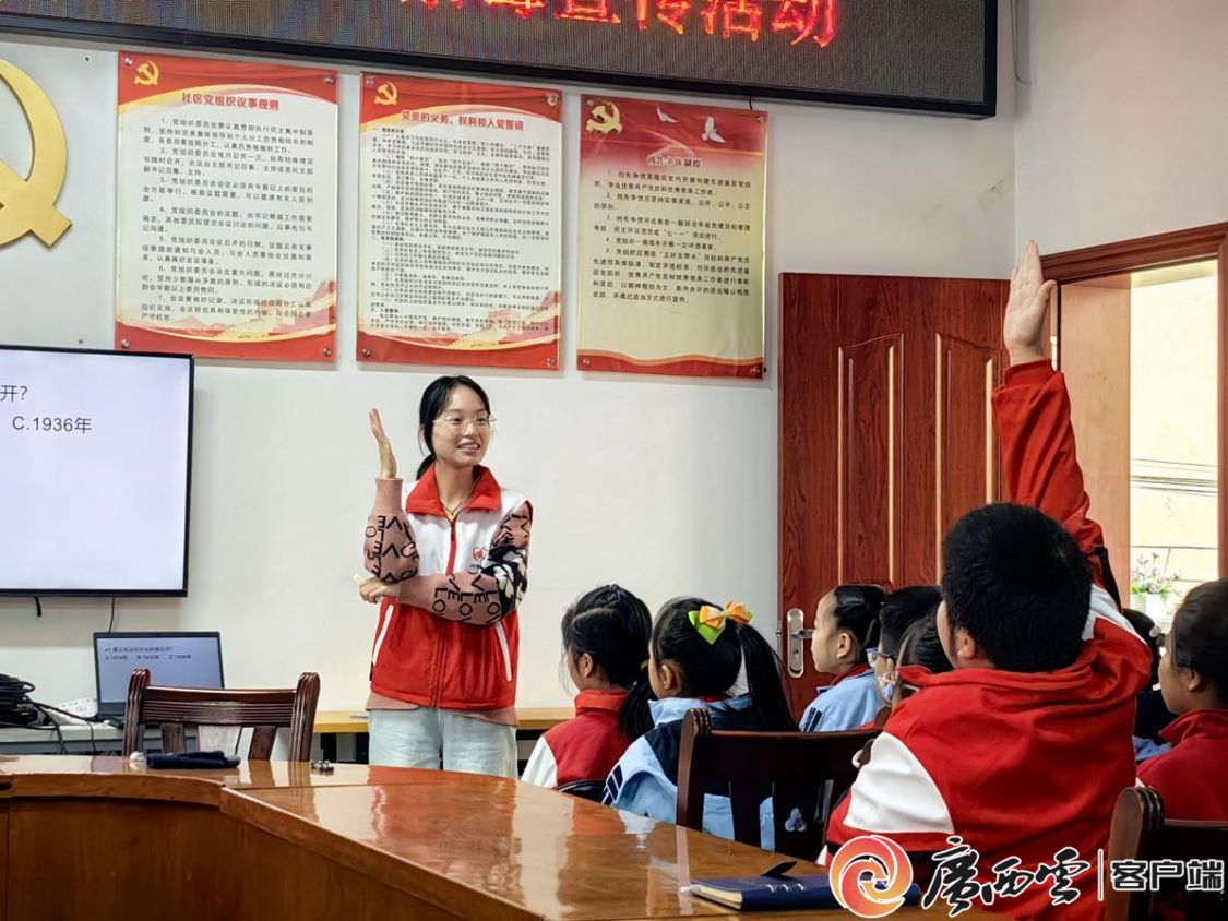 在志愿服务宣讲活动期间,beat365英国官方网站化学化工学院“爱心支教服务队”志愿宣讲团以实践宣讲为指引,深入南宁市多个社区与中小学校,开展十余场遵义会议精神宣传讲解活动,辐射在校学生、社区居民,企事业单位员工等800余人,让遵义会议精神在八桂大地点燃星星之火。用鲜活生动的形式把红色历史讲给孩子听,让红色种子播进童心里。