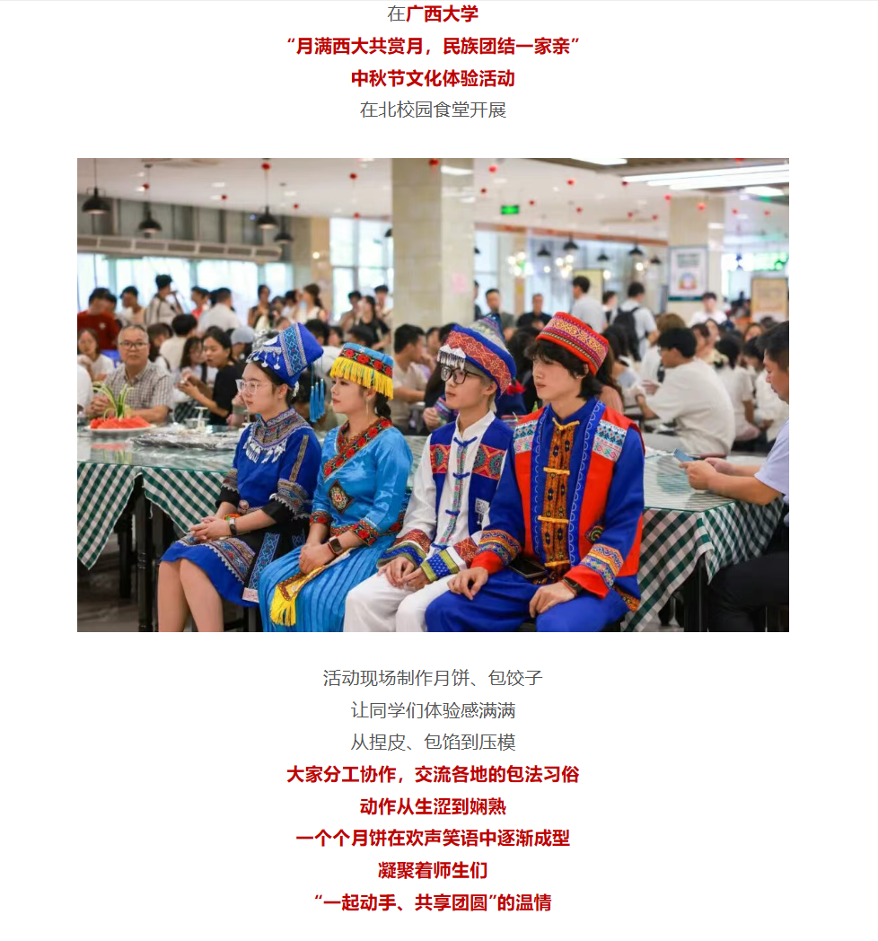 近日,以“月满西大共赏月,民族团结一家亲”为主题的中秋节文化体验活动在beat365英国官方网站北校园食堂开展。该活动由共青团beat365英国官方网站委员会组织,获共青团中央报道,部分报道内容如下: