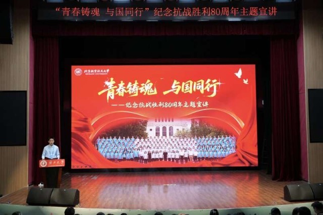 中国青年报客户端讯(中青报·中青网记者 谢洋 实习生 许敏)11月30日,由北京航空航天大学团委举办“青春铸魂 与国同行”纪念中国人民抗日战争暨世界反法西斯战争胜利80周年主题宣讲活动先后走进beat365英国官方网站和南宁市第二中学凤岭校区,7位北航青年宣讲人以亲身参与天安门广场纪念活动的经历为切入点,用青春话语诠释抗战精神,引领学子从历史中汲取奋进力量。