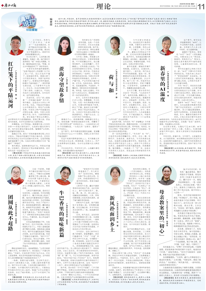 大年初二傍晚,我陪着父亲穿梭在甘蔗地里。甘蔗林郁郁葱葱,叶片轻轻擦过衣衫,发出窸窣的响声。父亲忽然蹲下,用手捧着土,对我语重心长地说:“你总觉得我喜欢自讨苦吃,但我返乡创业不是一时冲动,而是经过深思熟虑的。”他深知,广西是甘蔗种植的适宜区域,但家乡的甘蔗种植多沿用传统模式,品种单一、产量不高,产业仍有较大提升空间。近年来,他奔走各地,调研协商,克服重重困难,不会就学,不懂就问,有时甚至在车里凑合歇一晚。我知道,他肩上扛着的,不仅是个人的创业压力,更是建设家乡那一份沉甸甸的责任。