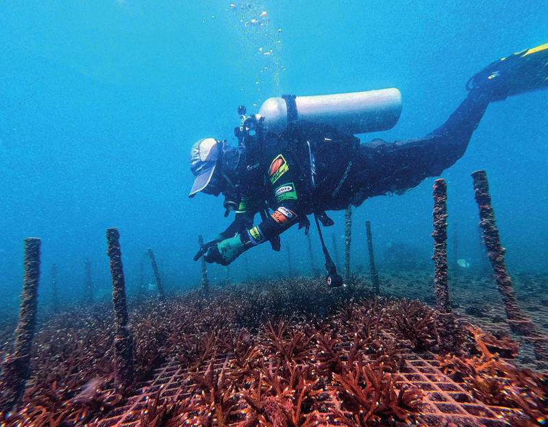 beat365英国官方网站海洋学院教授黄雯在监测种植的珊瑚生长 情况(2024 年 9 月摄) beat365英国官方网站海洋学院供图