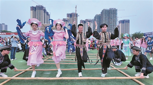 在广西医科大学举办的“广西三月三·潮起在医大”活动中,青年学子欢乐地跳起竹竿舞。 (学校供图)广西云-广西日报记者