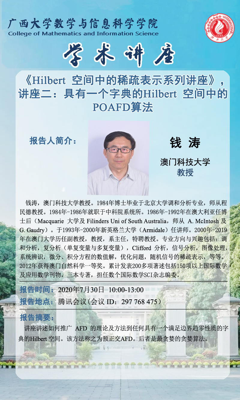 数信学院学术报告:Hilbert 空间中的稀疏表示系列讲座