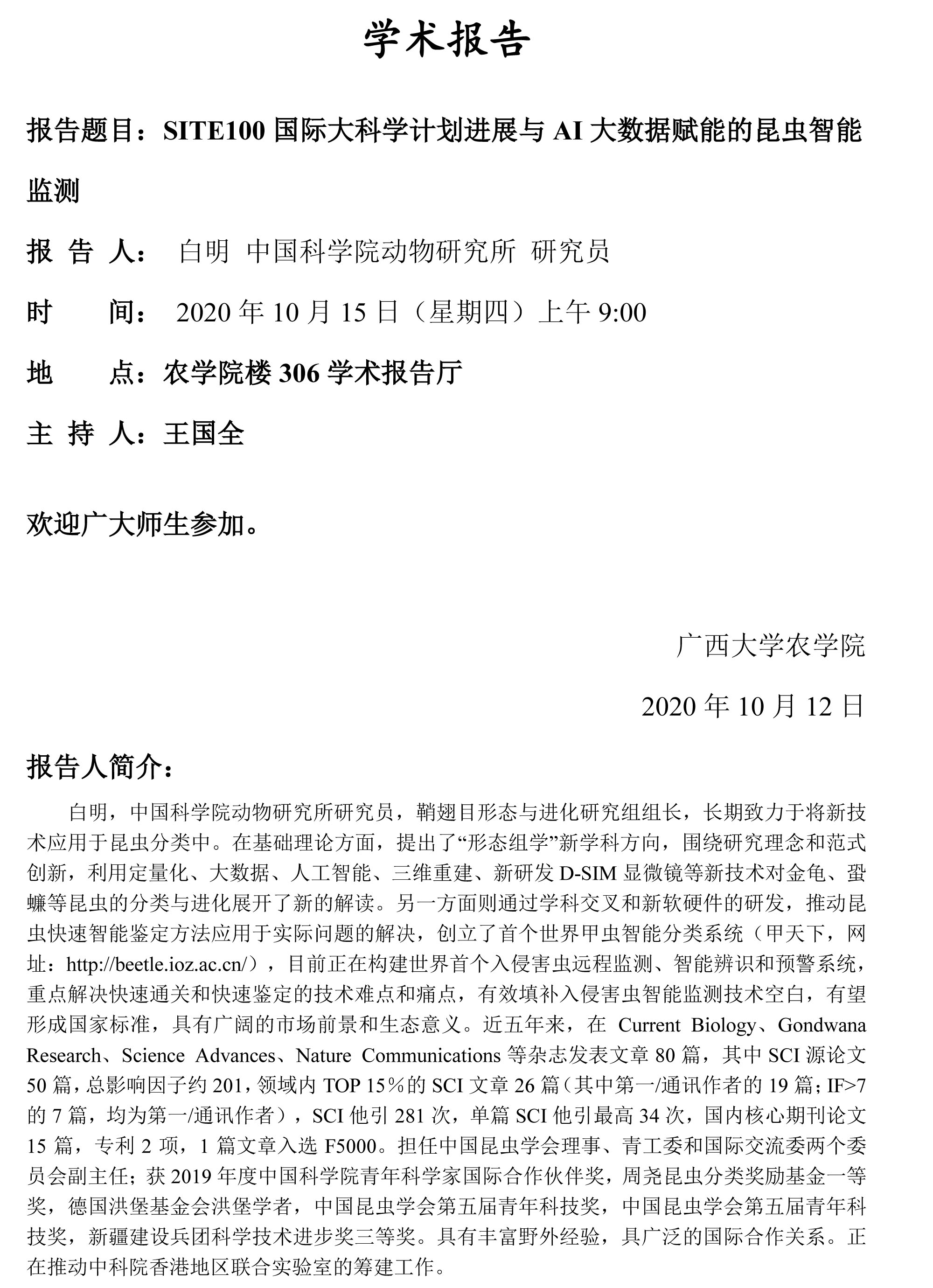 农学院学术报告:SITE100国际大科学计划进展与AI大数据赋能的昆虫智能监测