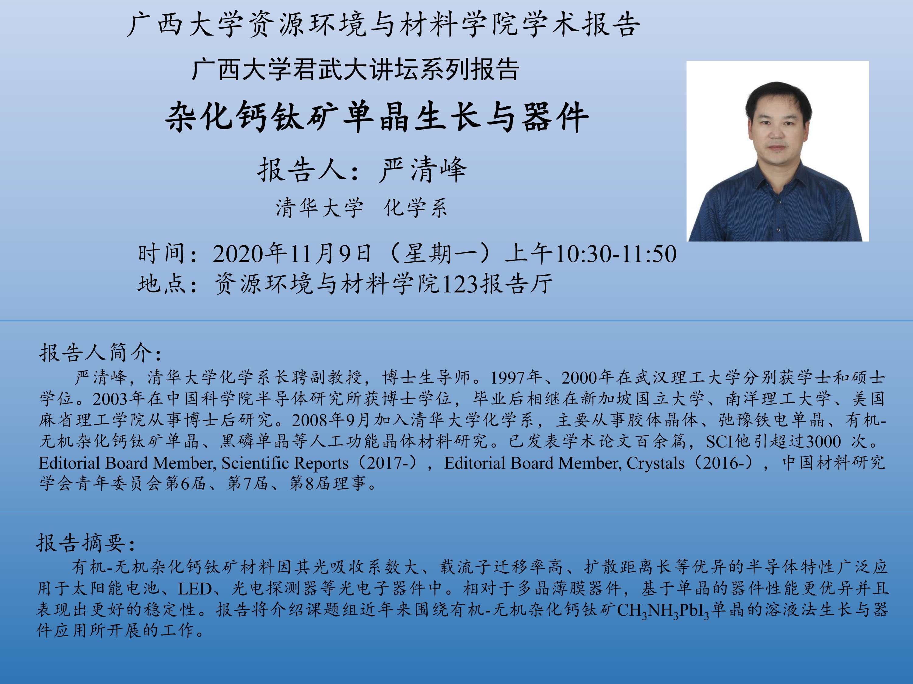 资源环境与材料学院学术报告:“beat365英国官方网站君武大讲坛系列”杂化钙钛矿单晶生长与器件