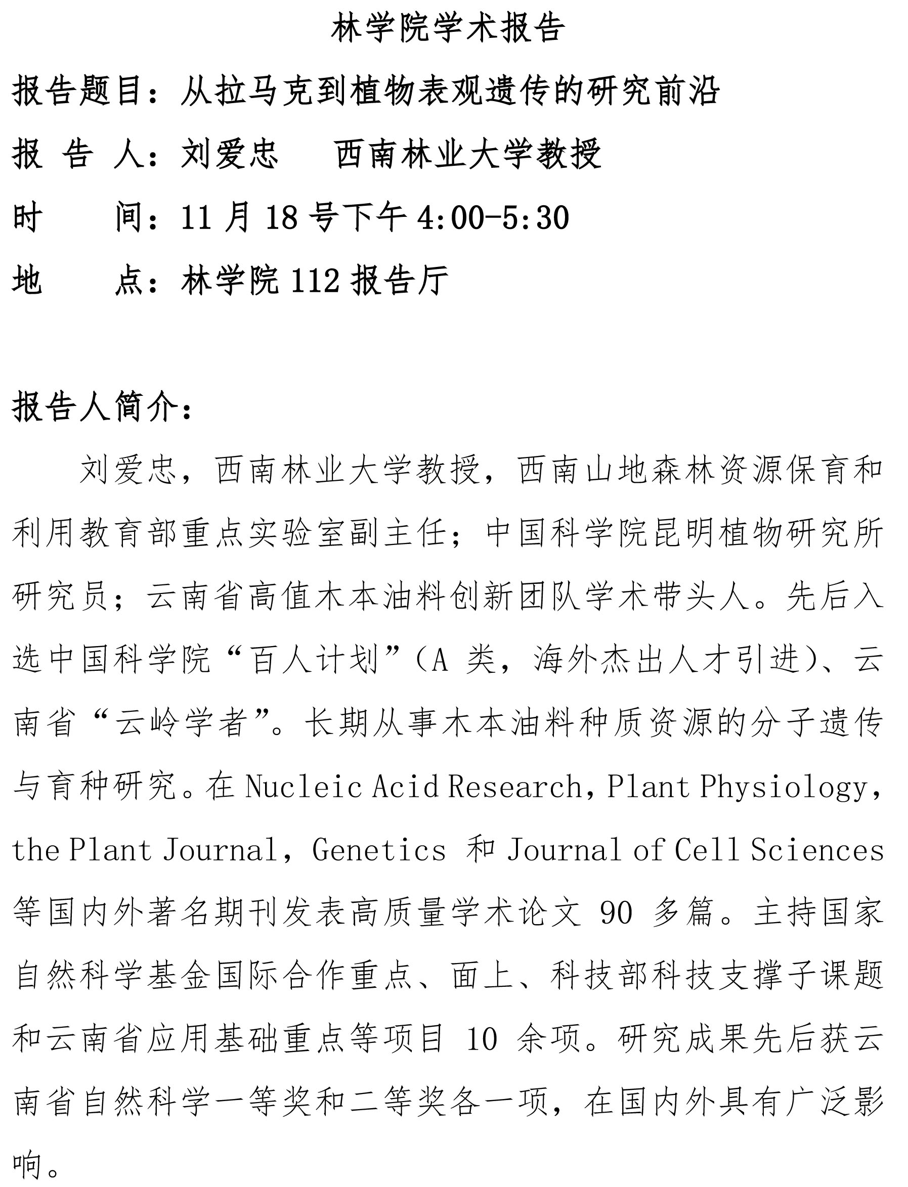 林学院学术报告:从拉马克到植物表观遗传的研究前沿