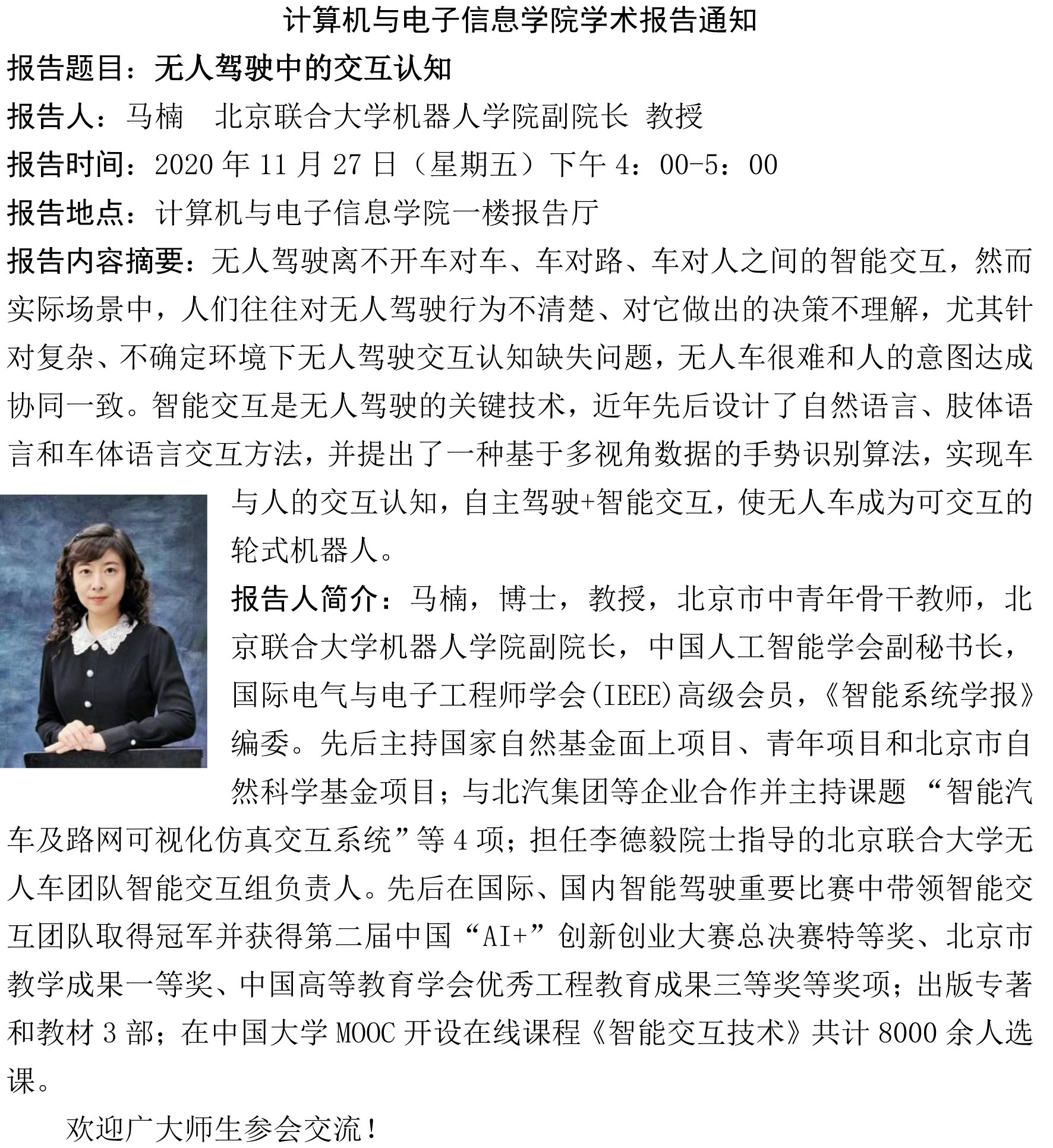 计算机与电子信息学院学术报告:无人驾驶中的交互认知