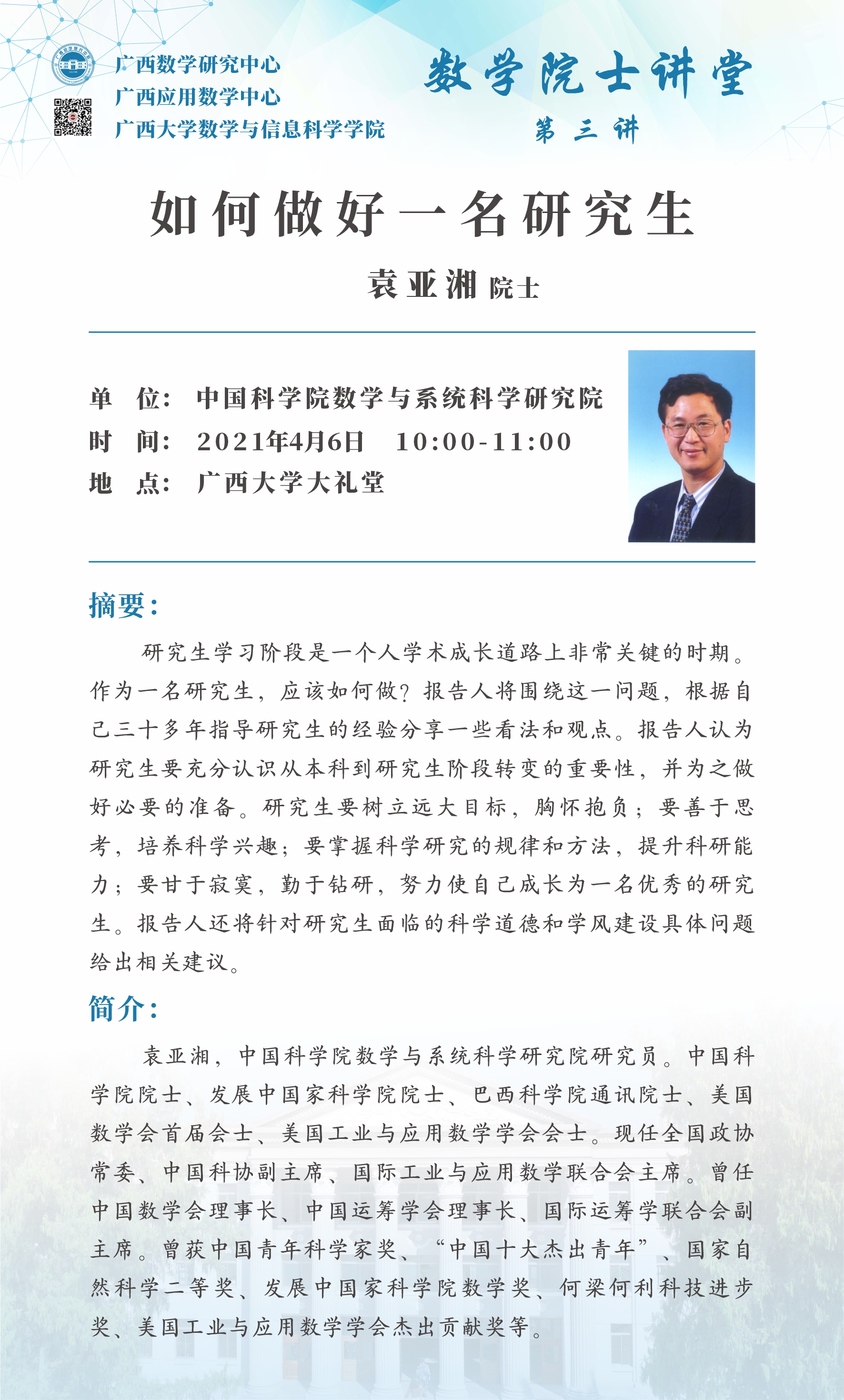 数学院士讲堂第三讲:如何做好一名研究生