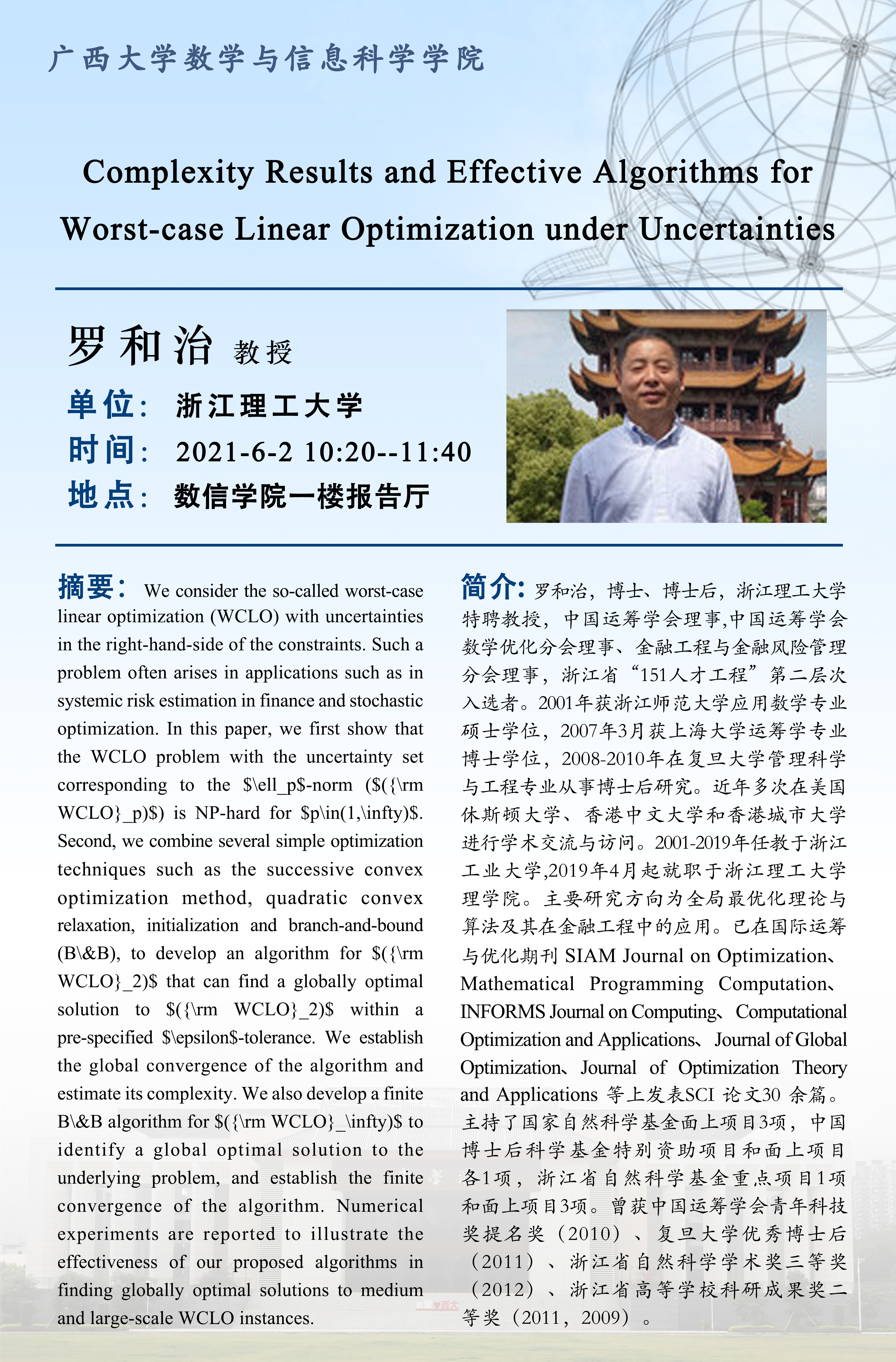 上一条:数学与信息科学学院学术报告:On the 3D relativistic Vlasov-Maxwell with large Maxwell field