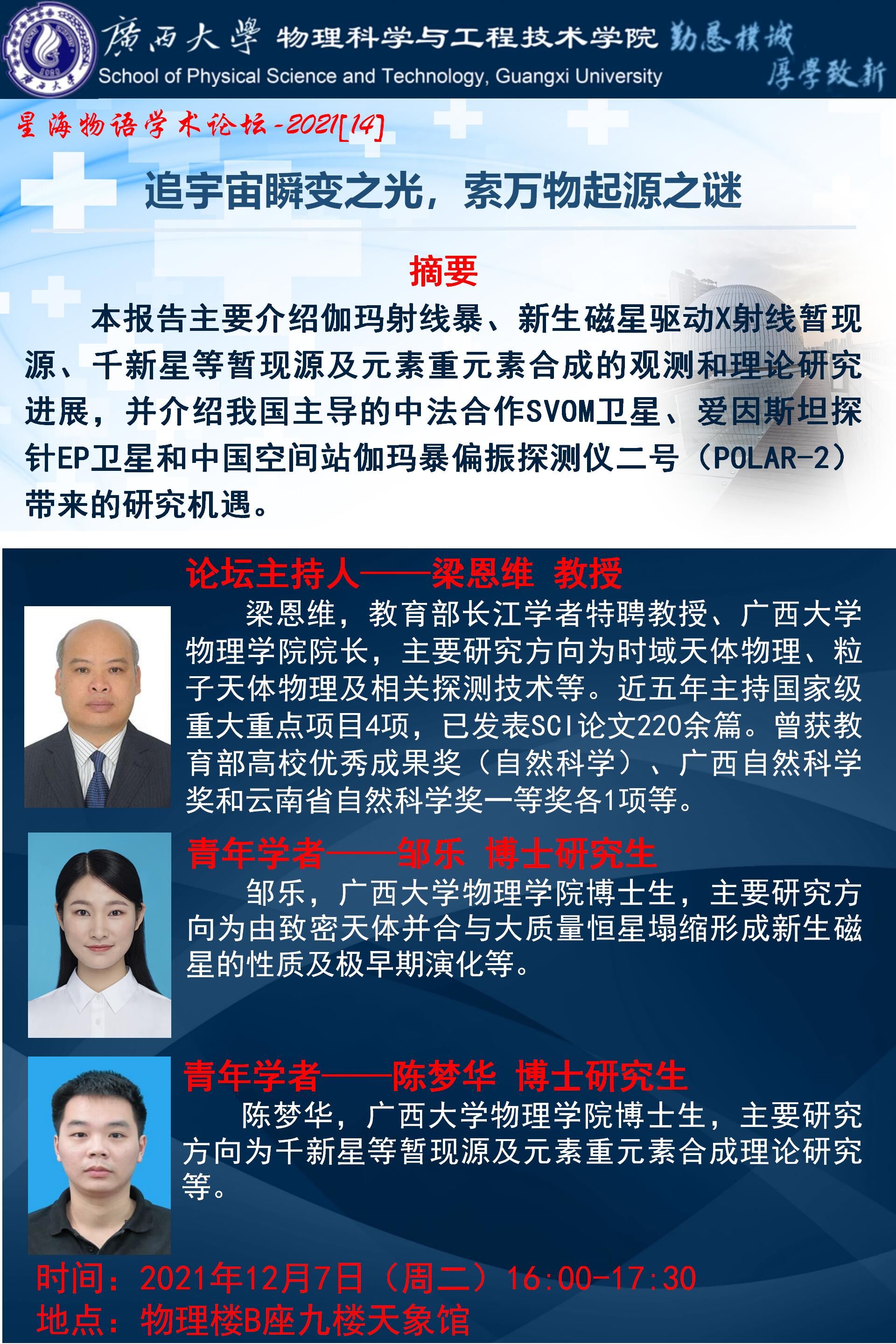 物理学院星海物语学术论坛(第十四期):追宇宙瞬变之光,索万物起源之谜