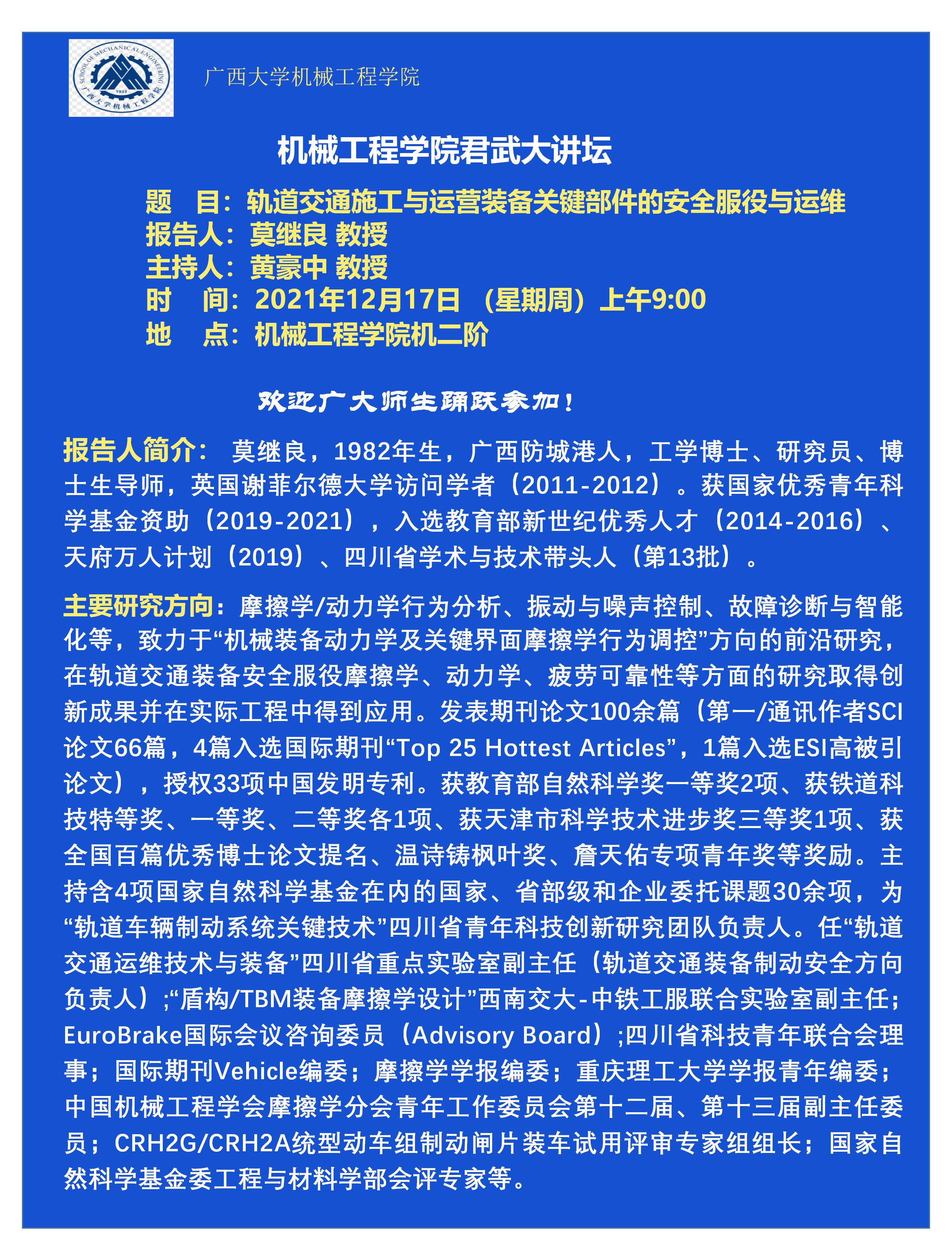 机械工程学院君武大讲坛:轨道交通施工与运营装备关键部件的安全服役与运维