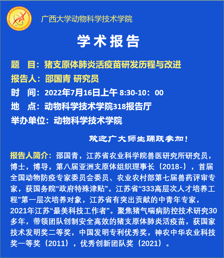动物科学技术学院学术报告:猪支原体肺炎活疫苗研发历程与改进